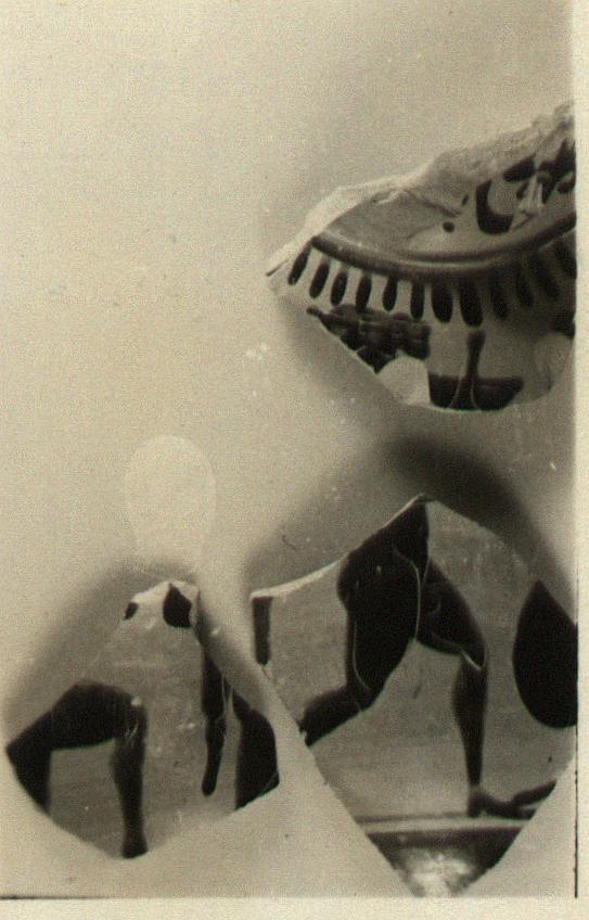 | Description: | From a small neck amphora. a) To the left, a vertical black line, probably the left edge of the panel. Beside it a nude male figure, missing above the waist, proceeds to the right, holdng his arms before him. In front of him, some object, perhaps part of a man seated on a diphros(?), perhaps the bottom of a squatting satyr, tail dragging on the ground(?). b) Above, part of the neck, decorated with a palmette; black bordered bands broken off to right. Separated from the shoulder by a moulded ring, painted red. On the shoulder, running from the base of the neck, black rays. Below them to the left, the top of the head of Dionysos, holding a kylix before him, crowned with a wreath touched with red. To the right, some object decorated in red. c) Left, a nude satyr running. In front of him, part of a draped female figure. | |