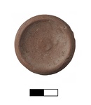 | Description: | Intact. Raised base, concave underside. Thickened rim, round on top. Untrimmed. Dark pink fabric. Possible votive dish. | |