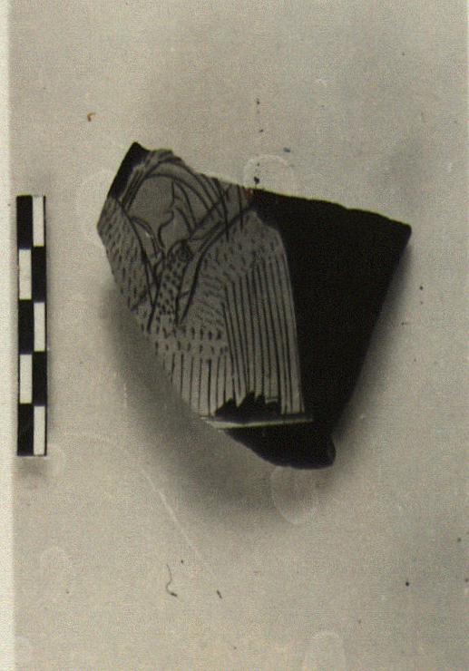 Description:   Mended from two pieces. From a small amphora(?) or squat lekythos(?). Fragment depicts Aphrodite riding on a goose(?). The bird is seen from the front, with both wings outspread; the head turned to the right. Above, the drapery of the riding figure, difficult to make out, but apparently seated right. Reserved ground line. No relief contours; the inner drawing in fine relief lines; the upper wing feathers brown; black dots on the neck.