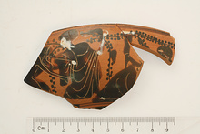 | Description: | Eight fragments, mended from eleven. Low base, hollow inside thick short stem. On the interior floor, a man, right, holding out his left arm over which is draped his cloak. On the exterior, at least three groups consisting each of a reclining draped figure holding up a great drinking horn and in front of him a satyr pursuing a woman. In the field, tendrils. White for the women's flesh and tops of the drinking horns; red on men's fillets, women's dresses and satyrs' faces. Good black glaze. | |