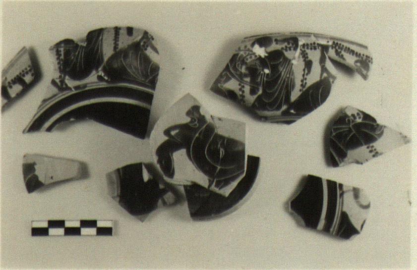 | Description: | Eight fragments, mended from eleven. Low base, hollow inside thick short stem. On the interior floor, a man, right, holding out his left arm over which is draped his cloak. On the exterior, at least three groups consisting each of a reclining draped figure holding up a great drinking horn and in front of him a satyr pursuing a woman. In the field, tendrils. White for the women's flesh and tops of the drinking horns; red on men's fillets, women's dresses and satyrs' faces. Good black glaze. | |