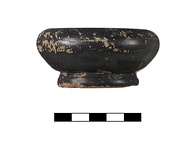 | Description: | Complete, chips missing from rim and foot heavily chipped. Glaze scratched and flaking in spots. Ring foot, flat resting surface; nipple underside. Fired black and gray; resting surface reserved. Cf. Agora XII, nos. 944 (P 1960), 947 (P 22914), ca. 350 B.C. | |