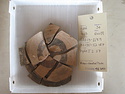 | Description: | Mended from ten fragments, about two-thirds of rim and handles missing, burnt on one side. Convex underside with string marks, slightly concave wall. Light orange-tan fabric, one large white inclusion. Dull reddish-brown glaze, band on interior just below rim and thick circle on floor. Cf. P 35968 | |