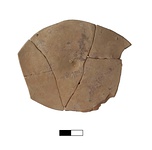 | Description: | Mended from five fragments preserving the center of the floor. Very warped. Slightly concave underside with string marks. Soft light micaceous yellowish-tan fabric, exterior partially covered with dull orange wash. | |