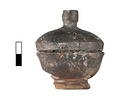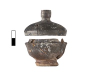 | Description: | a) Body, mended from about ten fragments, with large chips missing. b) Lid, mended from three fragments, complete. Body has solid foot with string marks on underside and side of foot unglazed. Offset rim to receive lid. Lid with downturned rim and convex top. Solid cylindrical knob on low stem. Dull brown gloss on body, metallic black on lid. | |