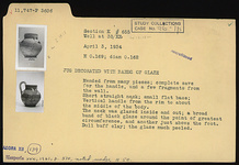 | Description: | Mended from many pieces; complete save for the handle, and a few fragments from the wall. Short straight neck; small flat base. Vertical handle from the rim to about the middle of the body. The neck was glazed inside and out; a broad band of black glaze around the point of greatest circumference, and another just above the foot. Dull buff clay; the glaze much peeled. | |