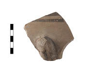 | Description: | Single fragment, broken on all sides, preserving small portion of shoulder, belly, and handle. Body rising steeply, shoulder curving in; horizontal handle, round in section. Paint mostly thickly applied and well adhering, fired black. Handle decorated with arch and bow. Two preserved horizontal bands above on shoulder. Fabric fine, close to light reddish brown 5YR 6/3-6/4. | |