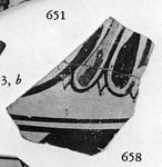 | Description: | Fragment from a large closed vase, preserving a bit of a large palmette-and-scroll pattern, with two narrow black bands, and a broad diagonal below. One petal red. The clay gray as if from burning. The glaze a firm black. Orientalizing style. ADDENDA White "slip" described by Brann (Agora VIII, no. 658) is actually residue/deposit, visible on all breaks as well as on surface and on back [SPM, 19 March 1980]. | |