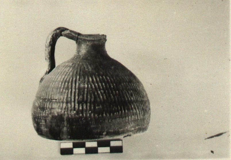 | Description: | Mended from three pieces; part of the lip missing. Flat bottomed jug with dome-like, almost hemispherical profile; narrow neck, wide flaring, almost horizontal lip. One vertical handle. The body decorated with vertical ribs, tending to cross each other at the top. Pinkish buff clay; the bottom unglazed. | |