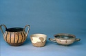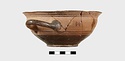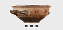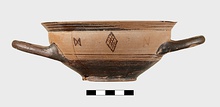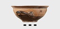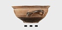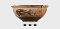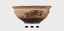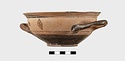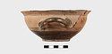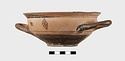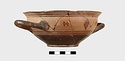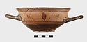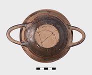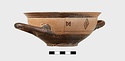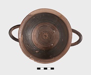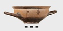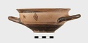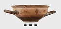 | Description: | Bowl with low ring base, convex side wall and outward flaring lip. Two horizontal loop handles. The lower body, to the points of attachment of the handles, is painted black; at the level of the points of attachment three narrow black bands. The handles are glazed black on the outside, unglazed inside. The upper body has, in black on each side, a latticed lozenge between two double-triangle hourglasses lying on their sides. On outer surface of lip, three narrow black bands; another on edge of lip. Interior, on inner surface of lip, four narrow black bands. Interior of side walls is glazed black; in center of floor, a round reserved panel is divided into eight segments by four lines crossing at the center; the space between this reserved circular panel and the black glazed side walls is filled by fourteen narrow circular bands, forming a series of concentric circles around the panel. Fine pinkish buff clay; the glaze dull brownish black. | |