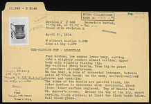 | Description: | Flat bottom; low convex lower body, curving to a slightly concave almost vertical upper body with slightly flaring lip. One vertical strap handle, from lip to point of greatest circumference. On the body, a zone of connected lozenges, between pairs of black bands; on the neck, conventionalized leaves and tendrils. The sides of the handle are painted black; its outer surface is decorated with horizontal black lines; inner surface unglazed. Top of handle has St. Andrew's cross. Around the top of the lip, short vertical black strokes; at least two black bands below. Dull black glaze. | |