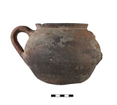 | Description: | Body complete, in one piece, but split open and warped on one side. Missing one handle; second handle, mended from two fragments, joins to body. Flaring rim. Series of three grooves on body just below neck. Vertical handle, oval in section, looped from belly to top of body. Exterior blackened from use. Coarse red fabric with mica. | |