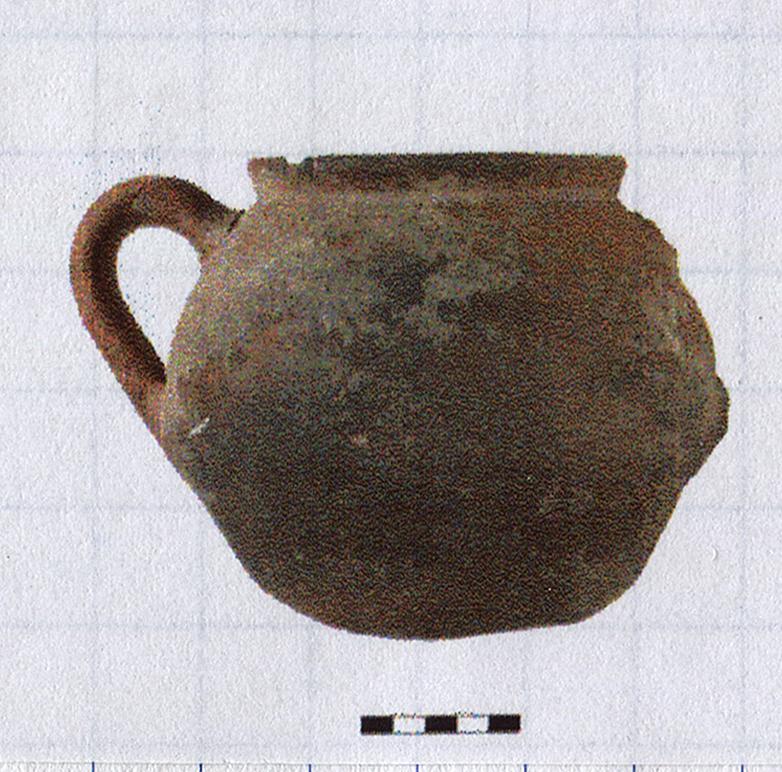 | Description: | Body complete, in one piece, but split open and warped on one side. Missing one handle; second handle, mended from two fragments, joins to body. Flaring rim. Series of three grooves on body just below neck. Vertical handle, oval in section, looped from belly to top of body. Exterior blackened from use. Coarse red fabric with mica. | |