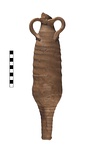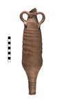 | Description: | Mouth missing, foot chipped and worn otherwise complete. Spots of iron stains. Small, fusiform, wheel-ridged body. Long toe and tubular foot. Two high loop handles. Pink-red micaceous fabric. Cf. Agora V, M 307 (P 11569). | |