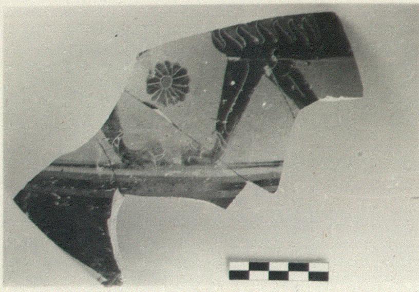 | Description: | From the wall of a large amphora; broken all around. Parts of two lions facing one another with a solid rosette between. They stand on a black line. The black ground below is bordered b y two purple lines. Purple for the manes of the lion and the heart of the rosette; free use of incision. Two fragments (ΟΕ 227) added 21 March 1938 give the foreparts of two lions opposed, but with heads turned back. A solid rosette between the heads, a band of double palmettes above the panel. | |