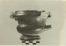 | Description: | Handles and much of wall missing. Moulded base ring; shallow lower bowl; high side wall; hollow rim; loop handles, horizontal. On the floor are four palmettes stamped within a circle of rouletting. A reserved line around junction of bowl and base ring. Rich black glaze. Cf. Agora XII, nos. 653, 655. | |