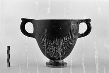 | Description: | Fragmentary; mended from several pieces; two small bits do not join. Small part of rim with one handle preserved. Flaring base; scraped, colored grooves round top and projecting lower part. Restored in plaster Attic clay; good glaze, much chipped especially on outside; glazed all over save scraped grooves and resting surface. | |