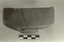 | Description: | Much missing from side wall. Flat bottom, slightly offset. Shallow lower bowl; tall, almost vertical upper wall. No trace of handle. Gritty red clay covered with a thin purplish wash. | |