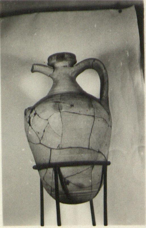 | Description: | Mended from many pieces; complete save for part of one handle, a piece of the lip, and small fragments. The handles very broad. Round bottom. Coarse red clay; buff slip. Unglazed. Cf. P 7872. | |