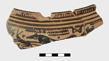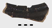 | Description: | Rim fragment of shallow dinos with portion of shoulder; broken at sides, glaze chipped and slightly pitted on exterior. Mended from three fragments. Short vertical rim with flat top, slight ridge at lip. Round shoulder. Two dogs chasing a hare to the left. In the field, zig-zag pattern, vertical wavy line, dots, and hourglass. Above, four horizontal bands. Along exterior rim, vertical bars. Thin metallic black glaze on interior. In the manner of the Workshop of Athens 894 or 897. Late 8th or early 7th c. B.C. Cf. for pattern, Agora VIII, nos. 347 (P 6579) and 359 (P 23655). | |