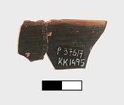 | Description: | Two joining sherds of rim to right of a handle, preserving just over 5% of the original circumference. Interior and exterior with thin, matt black glaze. On interior: reserved line at top of wall with added red line overtop. On exterior three added red lines 1.3 cm below rim, poorly preserved. Attic clay. | |