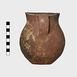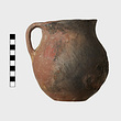 | Description: | A crudely made jug with flat bottom and broad ribbon handle. The neck is more open than that of P 3760. Coarse red micaceous clay showing heavy traces of burning. Handmade. | |