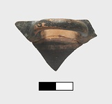 | Description: | Fragment of one handle, handle panel and start of wall; rim less than 15% of original circumference preserved. Mended from two pieces. Glaze flaking, especially on handle. Bell handle. Glaze dull black, unevenly applied around handle attachment. On exterior: two added purple bands beneath handle, and splotch of added purple on underside of handle. Attic clay. | |