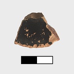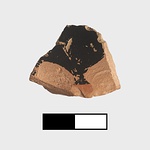 | Description: | Single fragment preserving ca. 15% of the original circumference of the foot. Lightly tinged gray at core from burning. Flat top, exterior face of foot slightly concave, flat resting surface, interior face curving up to stem. Shiny black glaze flaking on underside and exterior. Reserved: exterior face of foot; resting surface, both with miltos. Attic clay. | |