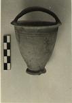 | Description: | Complete. Flaring ring base; horizontal projecting lip, spanned by a flat, slightly concave handle. Two grooves around the cup below the lip. Red clay; unglazed, the surface gray. | |