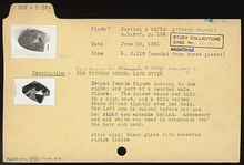| Description: | Mended from three pieces; broken all around. Draped female figure (maenad) dancing to the right; before her, part of a bearded male figure (satyr). The dancer wears a thin chiton drawn rather tightly over her body; her hair is in a high knot. Her left arm is raised before her and her right arm extends behind. Accessory red and white are used in ornaments for the hair and neck. Attic clay; black glaze with reserved stripe inside. | |