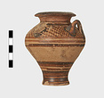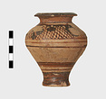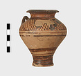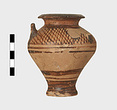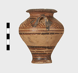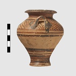 | Description: | Complete but for two missing handles (out of three) and chipped along base. Surface spalling on lower belly. Glaze slightly chipped on rim. Paint cracking at bases of handles and at rim where paint is thicker. Low neck with projecting downturned rim, piriform body, slightly splaying ring foot. Horizontal loop handle(s) at shoulder. Thick brown paint: on rim and on interior of neck. Diluted orange to brown paint on exterior of neck and lower body. On shoulder, well preserved net pattern above three diluted lines fired orange to dark brown; on lower body, three sets of horizontal framing bands, varying in width. Underside of base, reserved. Fine, pinkish-yellow fabric. Mycenaean LHIIIA1. Cf. P. Mountjoy, Guide to Identification (1986), p. 56, FS 44, no. 3, fig. 62. Sample of fill from inside the vessel: AS 2224. | |
