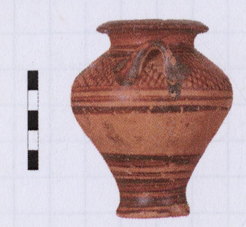 | Description: | Complete but for two missing handles (out of three) and chipped along base. Surface spalling on lower belly. Glaze slightly chipped on rim. Paint cracking at bases of handles and at rim where paint is thicker. Low neck with projecting downturned rim, piriform body, slightly splaying ring foot. Horizontal loop handle(s) at shoulder. Thick brown paint: on rim and on interior of neck. Diluted orange to brown paint on exterior of neck and lower body. On shoulder, well preserved net pattern above three diluted lines fired orange to dark brown; on lower body, three sets of horizontal framing bands, varying in width. Underside of base, reserved. Fine, pinkish-yellow fabric. Mycenaean LHIIIA1. Cf. P. Mountjoy, Guide to Identification (1986), p. 56, FS 44, no. 3, fig. 62. Sample of fill from inside the vessel: AS 2224. | |