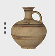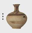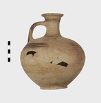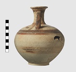 | Description: | Nearly complete. Mended from numerous pieces; missing several body fragments and chipped at rim and base; paint worn, minor incrustations. Globular body. Tall, narrow neck with flaring rim. Vertical strap handle from upper neck to shoulder. Flat base, slightly flaring. Rim and outer face of handle painted solid. Horizontal band below rim and at junction of neck and shoulder. On shoulder, five triple stems, hooked. Below handle, at lower body, and around base, pairs of horizontal bands. Reddish to dark brown paint. Fine, yellow fabric. Mycenaean LHIIIA2. For shape, cf. P. Mountjoy, Guide to Identification (1986), pp. 74-75, fig. 86 (FS 120). For decoration, cf. Ibid., p. 68, no. 5 (FM 19). | |