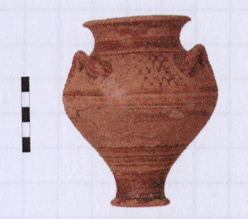 Piriform body, low neck, wide mouth with flaring rim. Two small horizontal handles on shoulder; break for attachment of a third. Splaying ring foot. Painted solid: rim, interior and exterior of neck, and handles. On shoulder, between handles, scale pattern. On belly and lower body, parallel, horizontal banding. Underside unpainted.