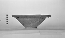 | Description: | Mended from three pieces; small bits missing from one side. Ring foot; the sides flare to a plain edge, beneath which are attached two close horizontal handles. Red clay with a buff slip outside and a thin brownish wash smeared over the inside, the tim, and the tops of the handles. Hellenistic. | |