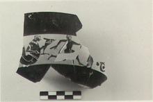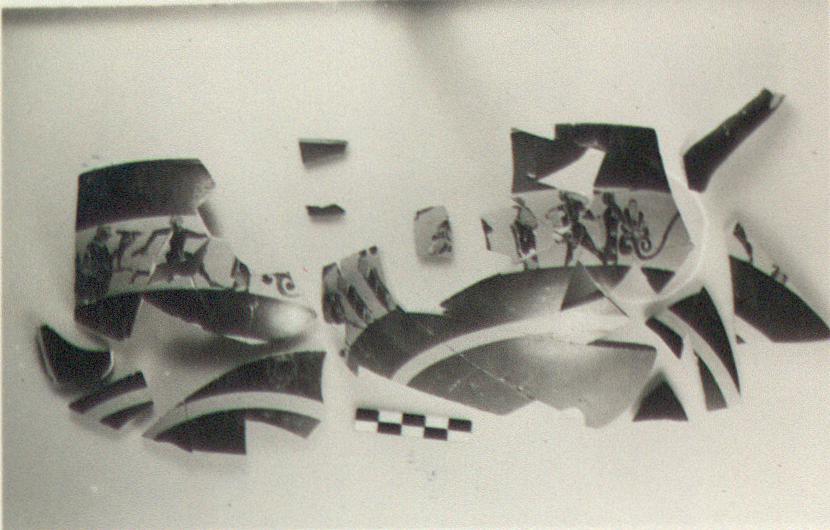 Mended from many fragments which make up into two principal groups. These two groups include all the figured fragments, save two, and even these can be assigned with some assurance one to each group. The remaining fragments (in all 12, making up to 8) include a bit of a handle, a bit of a rim, a bit of plain black, and numerous bits on which the narrow reserved band below the decorated band appears.