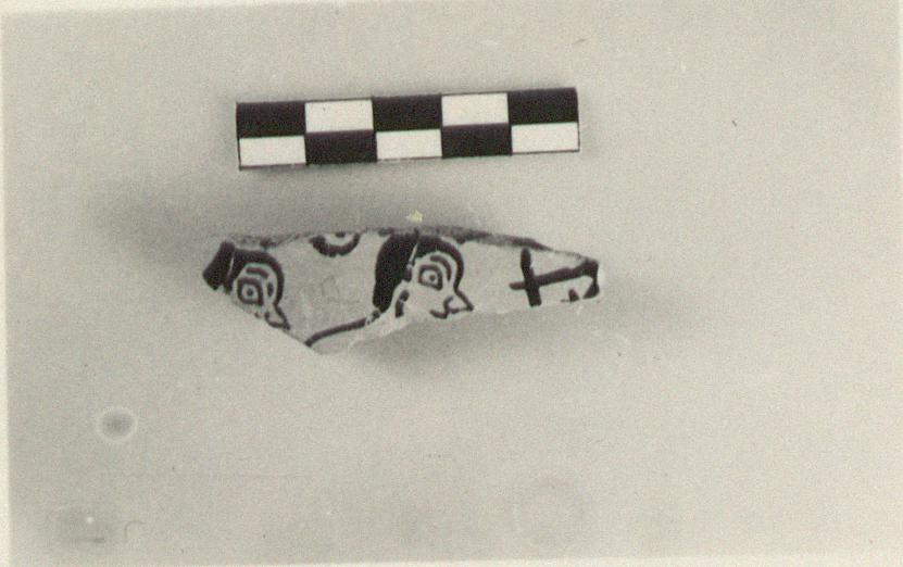 | Description: | Broken all around. Two heads right. Before the right hand one a lyre(?). Interior, thin black glaze; a shoulder fragment. Buff clay with bits. | |