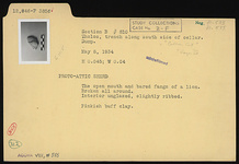 | Description: | Broken all around. The open mouth and bared fangs of a lion. Interior glazed, slightly ribbed. Pinkish buff clay. | |