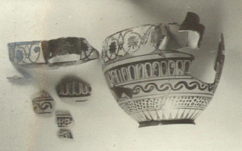 | Description: | Parts of one handle, rim, walls, and foot are missing. Black, brown, or reddish, used as on P 3885. Ornamental bands as follows, top to bottom: lotus and palmette, tongue pattern, running-dog, dots, rays. Purple as on P 3885 inside, and outside for outer leaves of lotus, and for the broad line below them. Clay rough, buff to pink; glaze less metallic than P 3885. | |