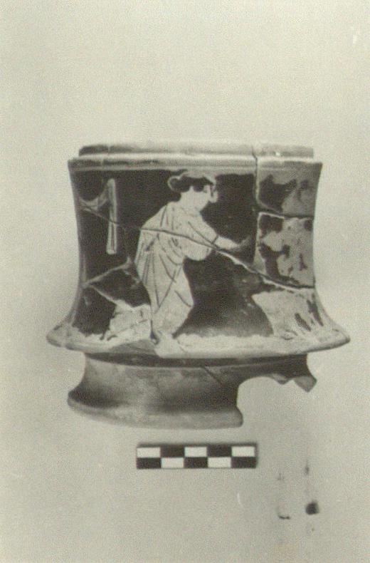 | Description: | Parts of two legs broken and missing, as well as fragments of walls and the lid. Black glaze inside and out; reserved (or in thin glaze paint?) seem to have been the outside of the foot, and the underside, except for a band close to the bottom, and two circles around a dot in the center. The glaze is much damaged, but the scene is clear: a woman moving left toward a door, is looking back toward a second woman who moves toward right, her arm outstretched toward a third woman. The latter faces and moves left, one arm stretched in front of her holds something above a basket on the floor. Her other arm reaches out behind, toward the door. Between the first and second figures, a long fillet or garment hangs on the wall. | |