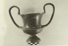 | Description: | High swung handles, concave in section. Simple conical foot; bowl and upper body separated by a keel, with a thin rib above and below. Underside of foot, with tiny cone in center, is reserved. Clay fine, pink to buff, partly burned gray. The glaze inside and out is black, fair but streaky. | |