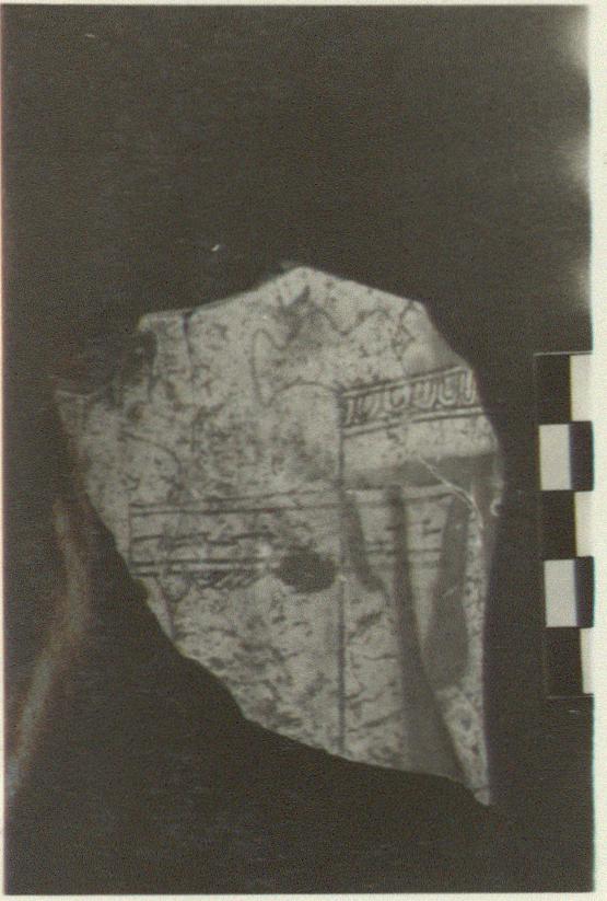 Description:   Preserved is only part of a scene, with outlines in matte red, with accessory purple and green. At left, part of upper body of a nude(?) figure facing right, holding a box or basket in her left hand. The box seems to extend across the stele at the right. Two green fillets hang from the box; the stele with a crude acanthos top and an egg moulding below it is hung with a purple fillet.