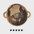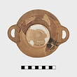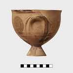 Description:   Portions of one side and the body missing, and one handle. Glazed inside and outside on the lower part and conical foot. Pendent loose lines from the horizontal handles. On the upper part, compass-drawn circles beside crosshatched diamonds in vertical panels set off by three lines. Bands above and below.