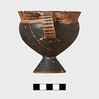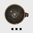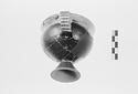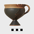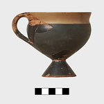 | Description: | Part of sides missing. Conical foot. Glazed on inside and out; narrow zone of zigzags in dilute glaze around the rim. Bars on the vertical handle, which is pierced at its root. The profile is more accentuated and the glaze in better condition than on P 3957-P 3959. Numerous other fragmentary examples of these cups may be found in the tins from this well. | |