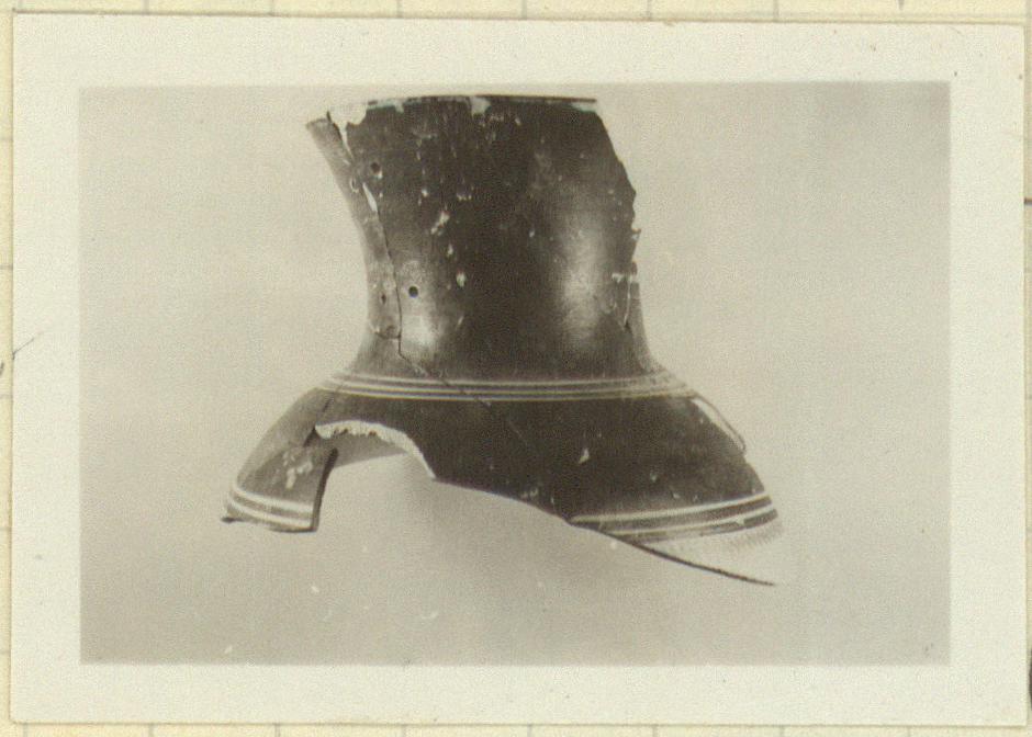 Description:   The neck and shoulder, fragmentary, of an open-mouthed vase, probably of hydria shape, black-glazed with reserved lines at the base of the neck, and a reserved band below the shoulder decorated with zigzags in dilute wash.