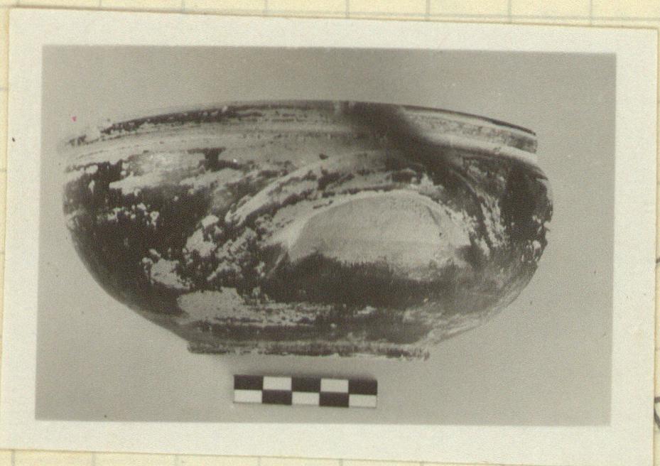 | Description: | Half of an open bowl, with a ring base and horizontal handle. Slightly out-turned rim. Glazed black inside and out, except for reserved lines around the rim. | |