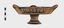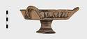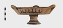 | Description: | Half a flat dish with deep upturned rim and high horizontal handle.Restored in plaster. High splaying foot. Outside, on the rim, tooth pattern; beneath and on the foot glazed bands of varying width; inside, a cross with dots at the edge of the circle between the arms, and glazed bands of varying width. Solid glaze inside the rim. | |