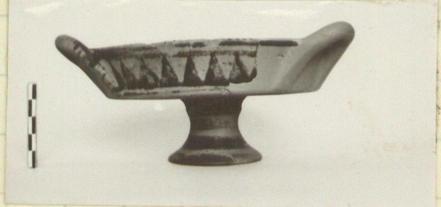 | Description: | Half a flat dish with deep upturned rim and high horizontal handle.Restored in plaster. High splaying foot. Outside, on the rim, tooth pattern; beneath and on the foot glazed bands of varying width; inside, a cross with dots at the edge of the circle between the arms, and glazed bands of varying width. Solid glaze inside the rim. | |
