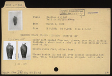| Description: | Upper part mended from many pieces; short handle from lip to high shoulder, and most of trefoil lip missing. Groove above flat, offset base. Glazed inside lip and all over outside including bottom. Thin, red-mottled glaze, chipped. Attic clay. | |