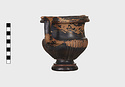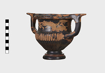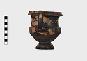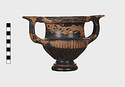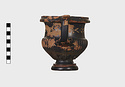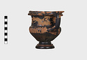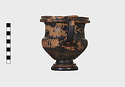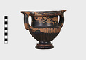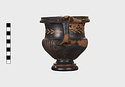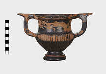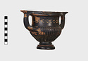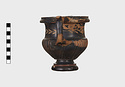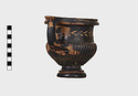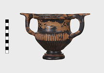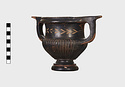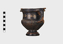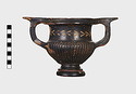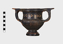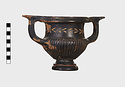Description:   Part of one handle and small chips from the side are missing: restored in plaster. Heavy foot with no stem; reeded bowl; thickened lip; handles flat on top ending in spurs. Around the neck a wreath of bay(?), in thinned clay. The foot was covered with red ochre before being glazed; now exposed by scratching in a line around the middle of the foot and one on its underside.